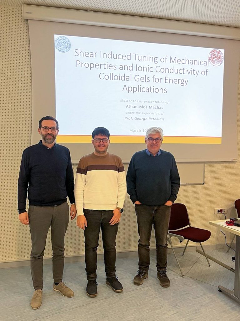 Thanasis Machas, member of the Polymer and Colloid Science Group at IESL-FORTH, on Tuesday 10th of March, brilliantly defended his Master Thesis entitled: “Shear Induced Tuning of Mechanical Properties and Ionic Conductivity of Colloidal Gels for Energy Applications”. His work was supervised by George Petekidis.